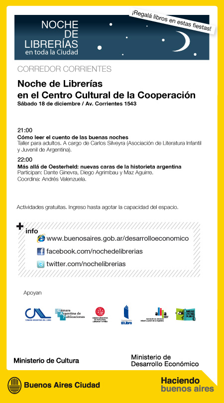 El encuentro, organizado por los ministerios de Cultura y de Desarrollo Económico porteño incluirá un recital ilustrado con el músico Kevin Johansen y el dibujante Liniers, y el cierre a cargo del músico Pedro Aznar. Durante la Noche de las Librerías se cerrará el tránsito vehicular desde Talcahuano a Callao y se desarrollarán, en simultáneo, múltiples actividades culturales en librerías, bares, salas de teatro y en la vía pública.